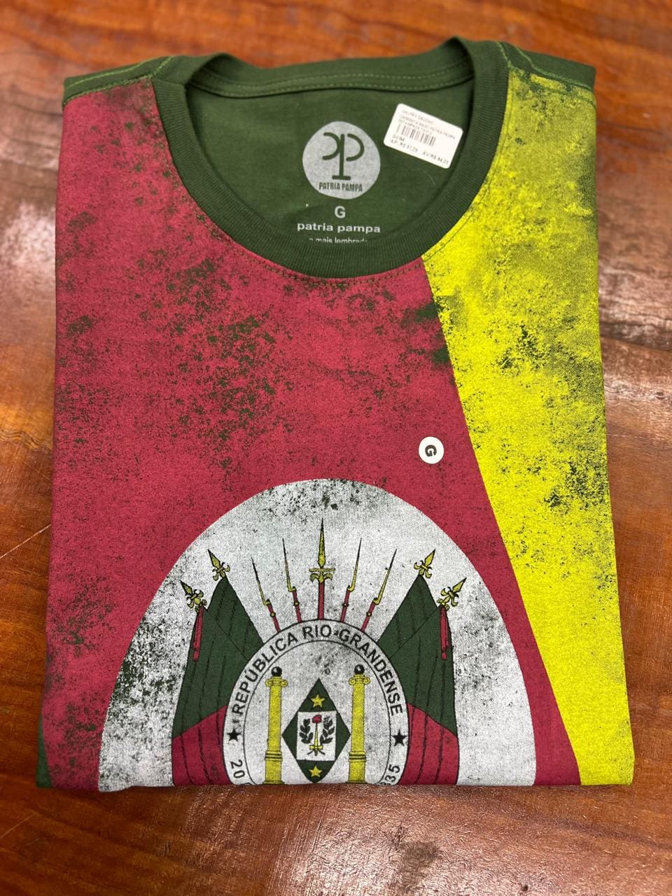 Camiseta gola redonda Pátria Pampa com estampa do Brasão do Rio Grande do Sul .