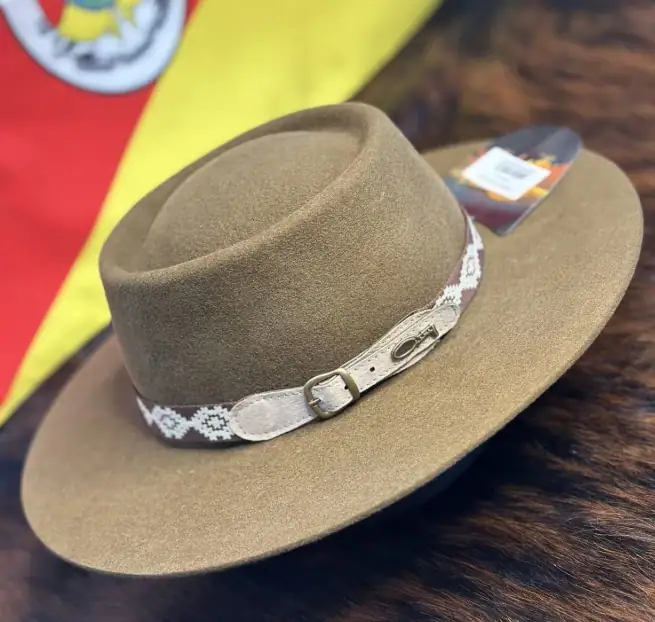 O Chapéu da marca Cury é feito de pelo e lã ,repelente a água, com um feltro de alta qualidade, o que o torna durável e resistente as temperaturas . Com uma cor café, ele apresenta uma aba larga de 8cm, copa tradicional de 9cm, com acabamento em bandinha de couro e pano detalhado com faixa pampa.