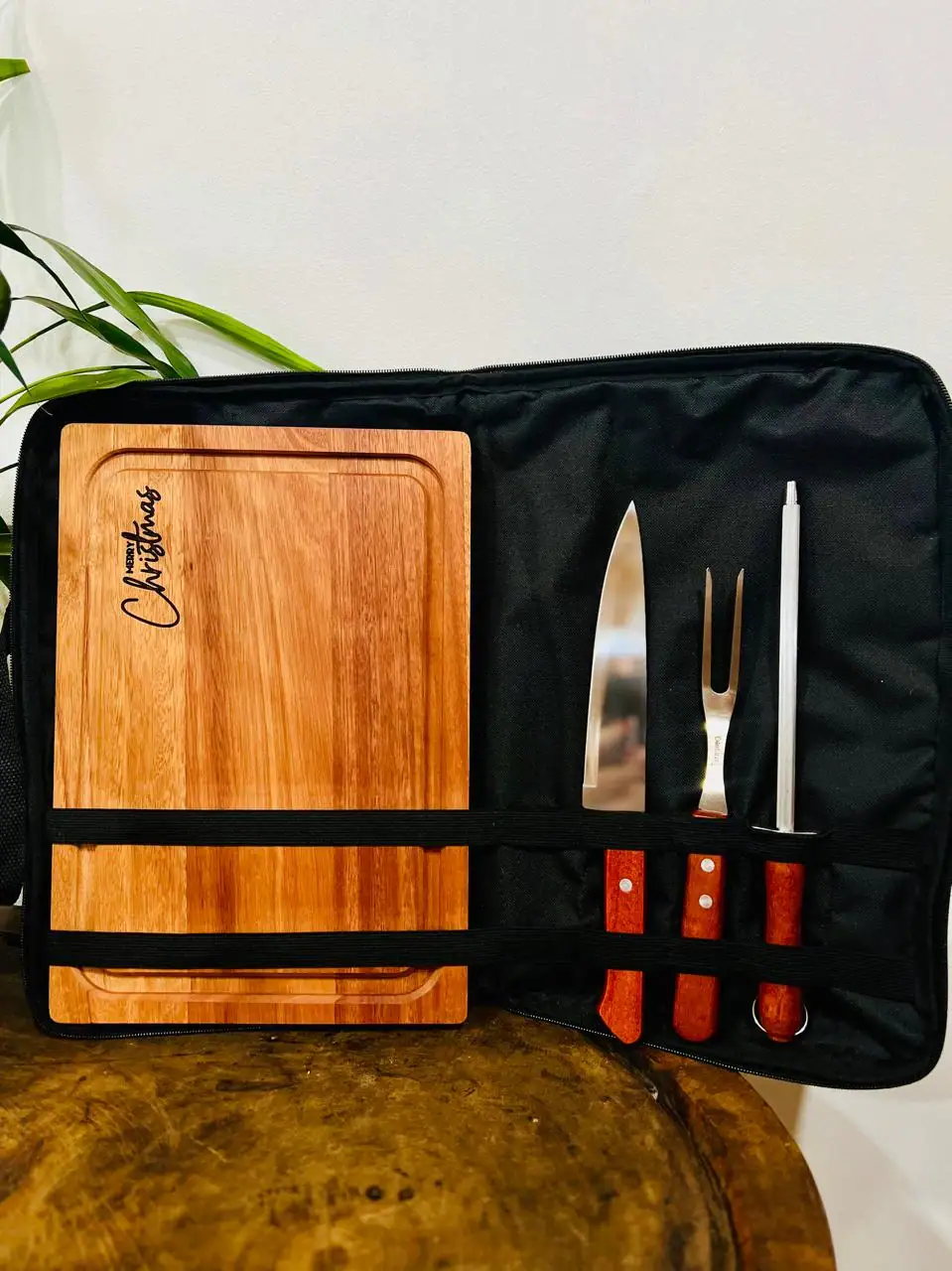 O kit conta com uma tábua rústica quadrada em madeira, além de faca, garfo e chave, essenciais para o preparo e o serviço do churrasco. Com design simples e acabamento rústico, é perfeito para uso no dia a dia ou para presentear, unindo durabilidade, funcionalidade e tradição churrasqueira.