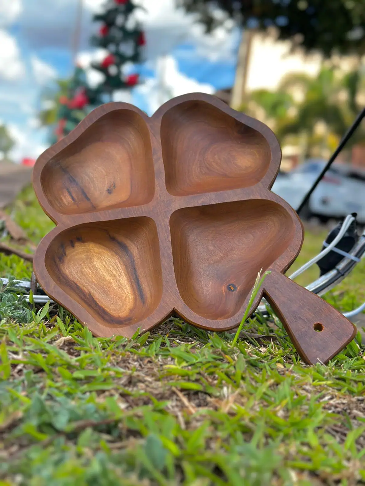 A petisqueira artesanal em madeira, com design exclusivo em formato de trevo, é perfeita para quem busca funcionalidade, elegância e um toque rústico na hora de servir. Com quatro compartimentos bem distribuídos, ela permite organizar diferentes tipos de petiscos, como castanhas, queijos, frios, molhos ou acompanhamentos, valorizando a apresentação.