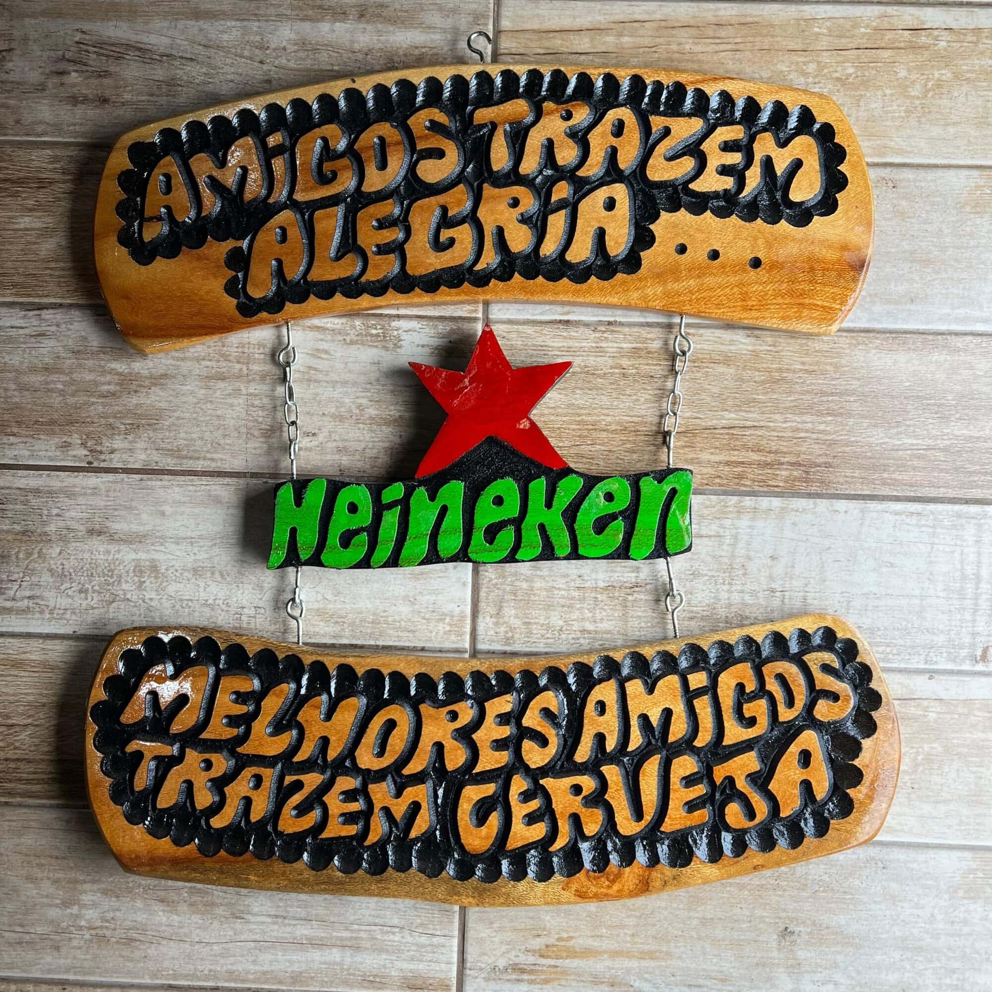 Traga humor e personalidade para seu ambiente com esta placa decorativa artesanal feita em madeira. Com acabamento rústico e letras em relevo pintadas à mão, a peça é composta por três partes unidas por correntes metálicas. As frases “Amigos trazem alegria” e “Melhores amigos trazem cerveja”, juntamente com a estrela vermelha e o nome estilizado da Heineken, criam um visual descontraído e perfeito para quem ama reunir amigos