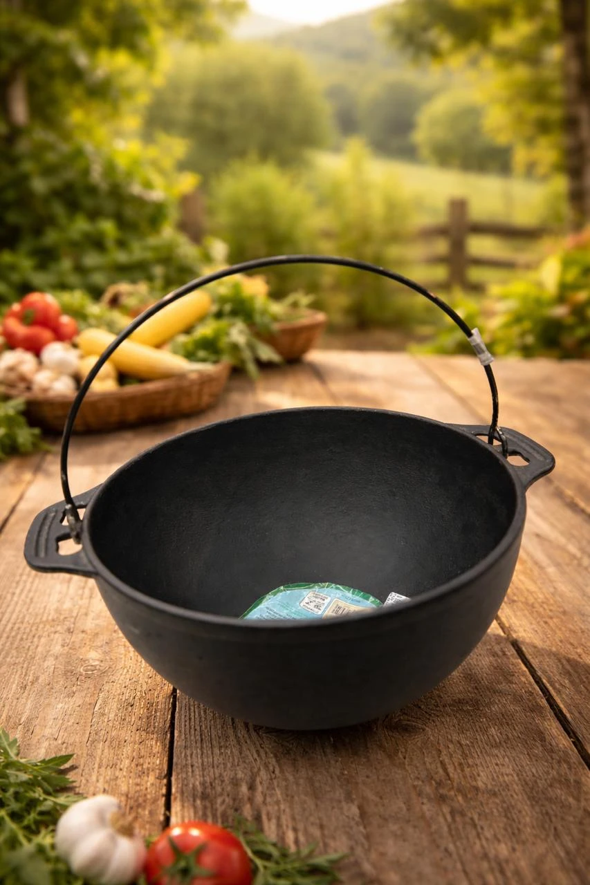 Panela de ferro fundido com alça, robusta e versátil, ideal para o preparo de receitas campeiras como arroz carreteiro, feijão, ensopados e até aquele churrasco de fogo de chão. Mantém o calor por mais tempo e garante um cozimento uniforme, trazendo o verdadeiro sabor da tradição para sua cozinha.
