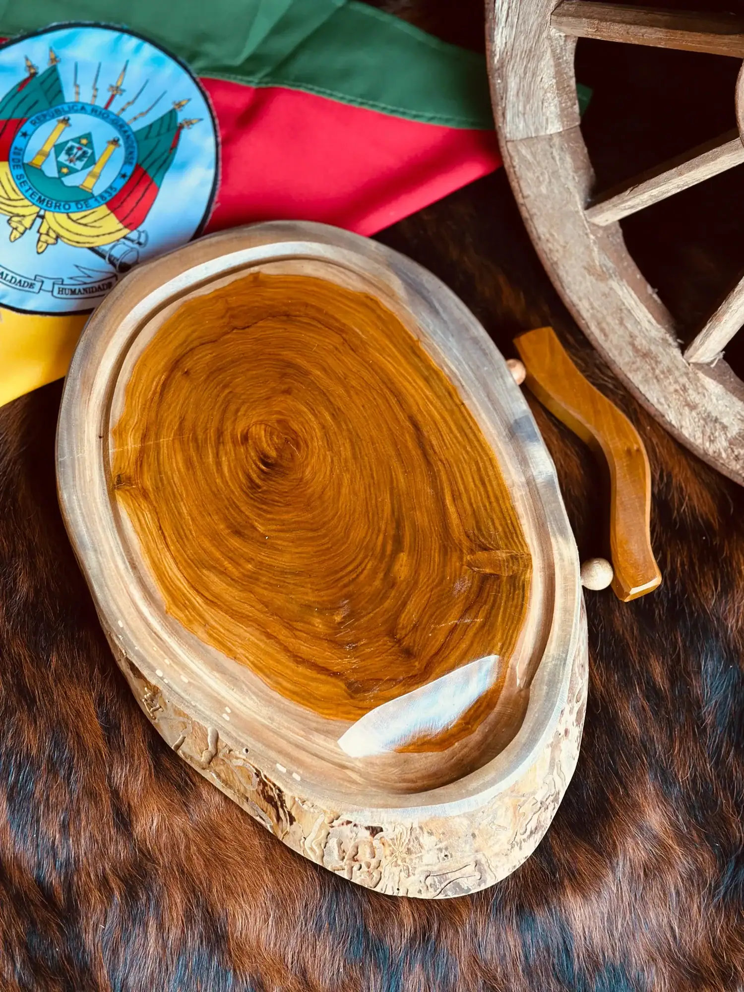 Ela é feita em madeira maciça, com formato orgânico/oval, mantendo as bordas naturais da árvore, o que valoriza ainda mais o desenho único dos veios.