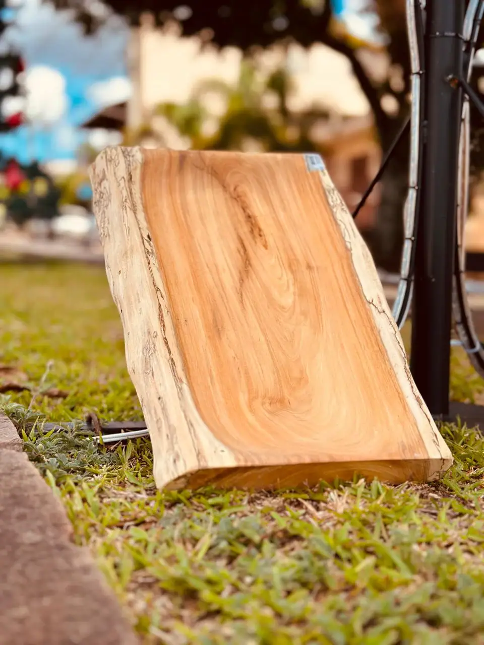 Tábua rústica em madeira maciça, com formato natural e laterais preservando o desenho original da árvore. Possui acabamento liso, que realça os veios marcantes e o tom quente da madeira, tornando cada peça única.